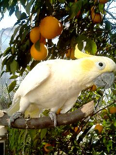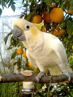 レモンの木をバックに初めて見る携帯に警戒するブンタをパチリと
